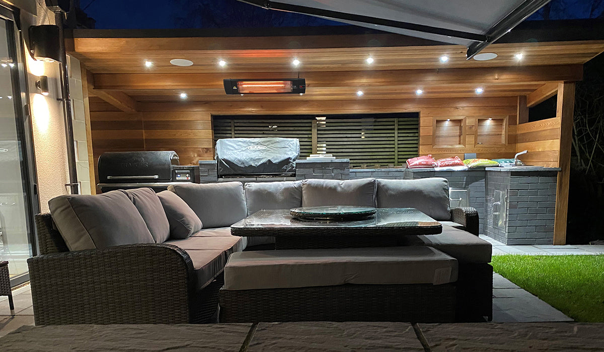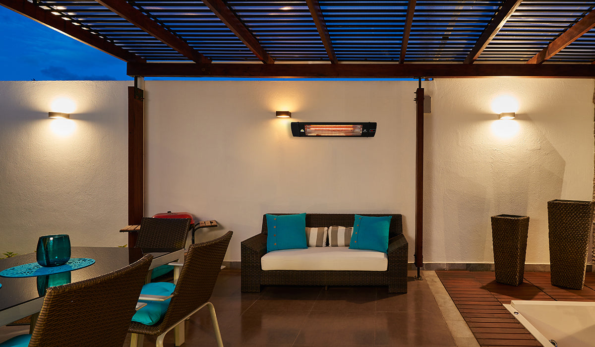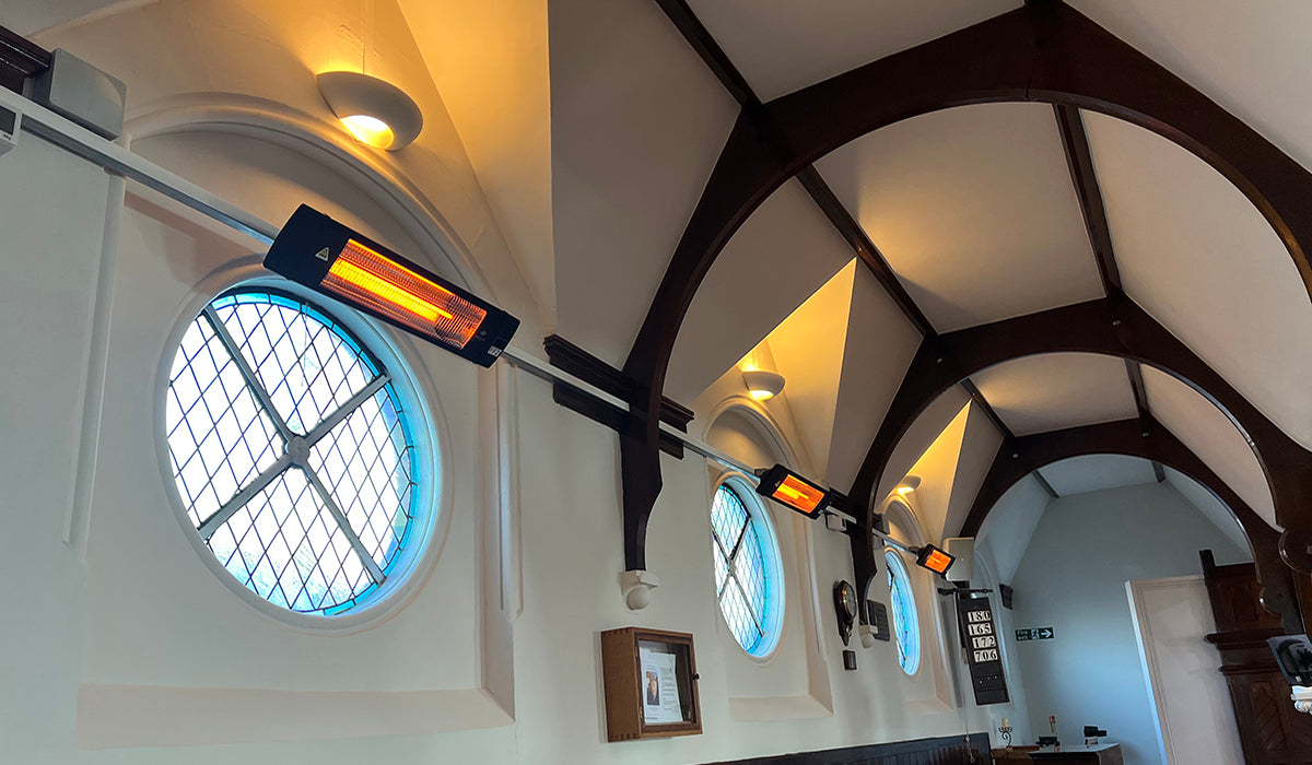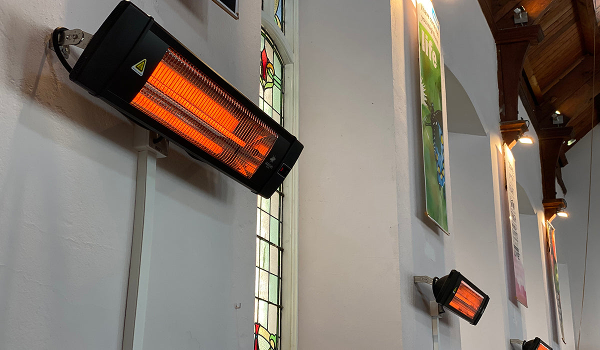As always in exposed areas with air movement and wind, infrared spread may reduce by 1/3 to 1/2. In these areas we recommend mounting at the lowest height and proportionally increasing the number of heaters.
