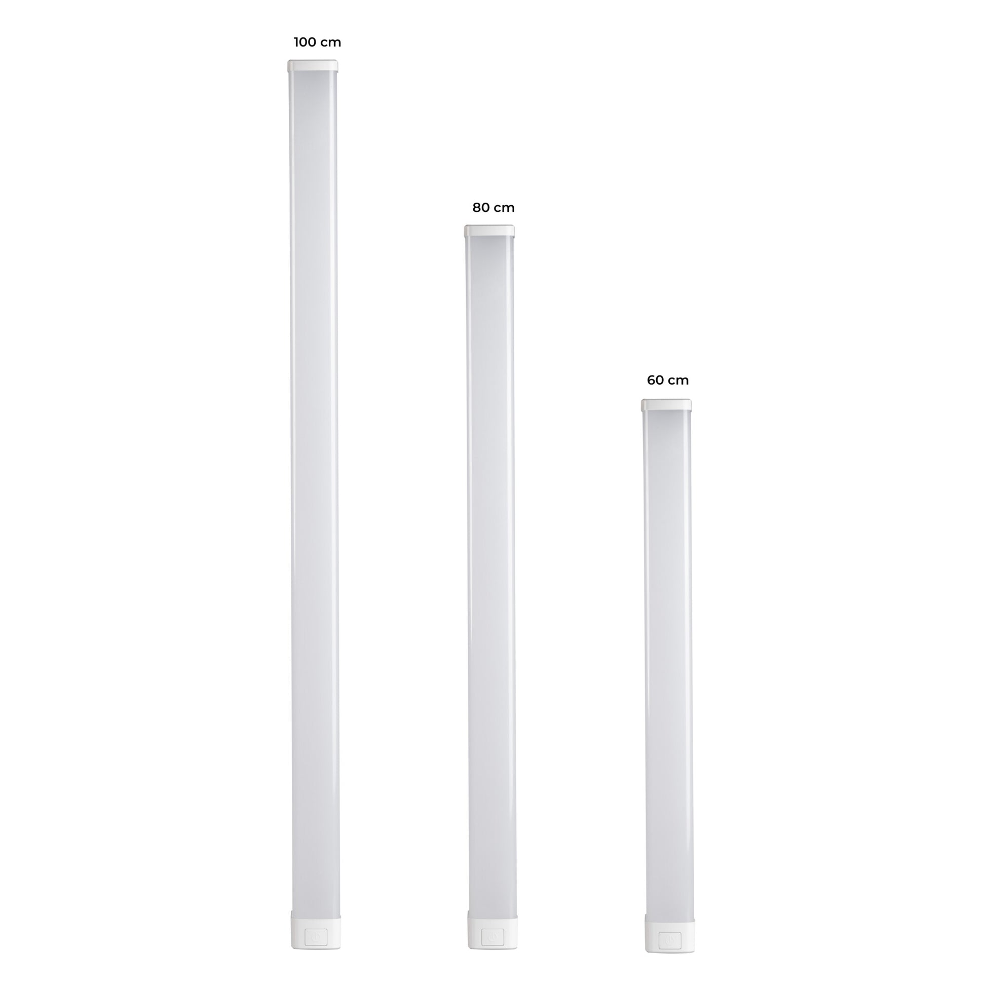 Kanlux AKVO IP44 S are wall and ceiling luminaires in three colors: white, chrome and black. The luminaire is available in 3 lengths and three powers: 60cm - 15W, 80cm - 20W and 100cm - 23W. Kanlux AKVO S lamps can be mounted vertically and horizontally, on the wall or on the ceiling, which creates virtually unlimited arrangement possibilities. In addition, these lamps have increased resistance to moisture IP44, which means that you can safely mount them in the bathroom or laundry room. Kanlux AKVO IP44 S lamps are perfect for lighting rooms such as a bathroom, laundry room, utility room, corridor or wardrobe. Kanlux AKVO IP 44 S are equipped with a discreet switch located in the housing of the luminaire. These lamps have a high luminous efficiency, over 100 lumens per Watt, thanks to which they help you save electricity.